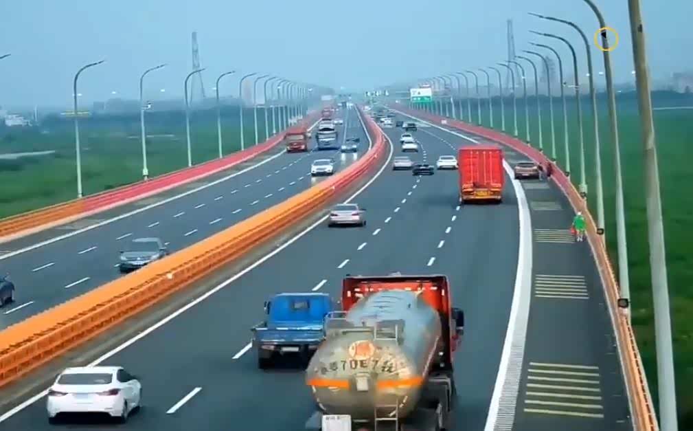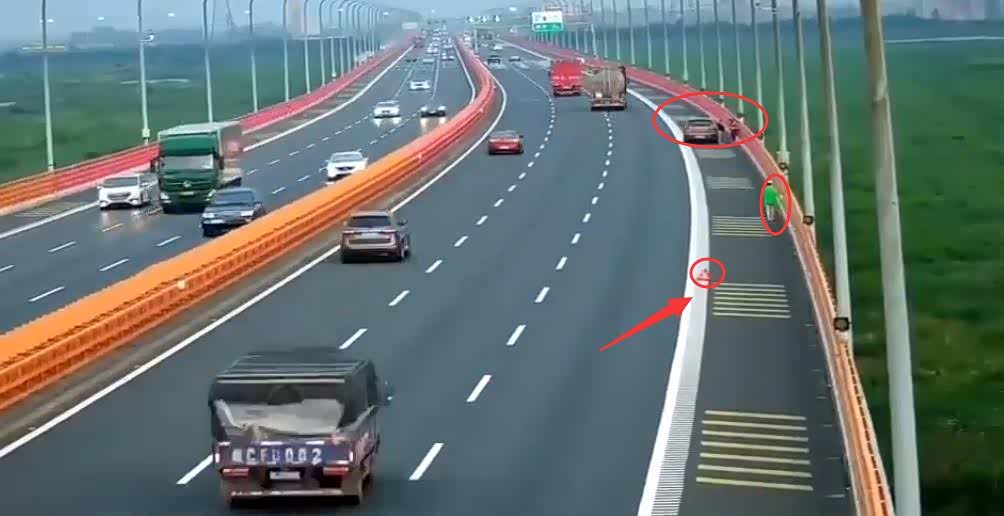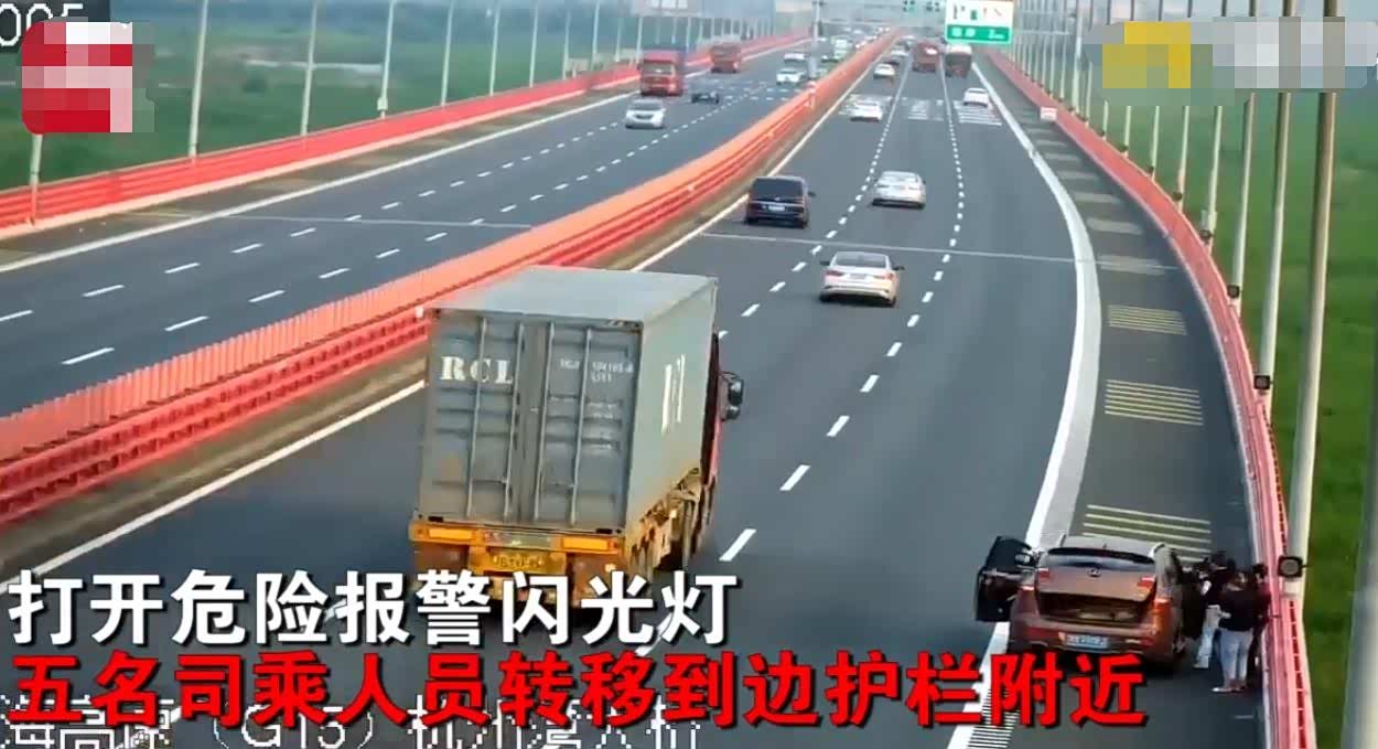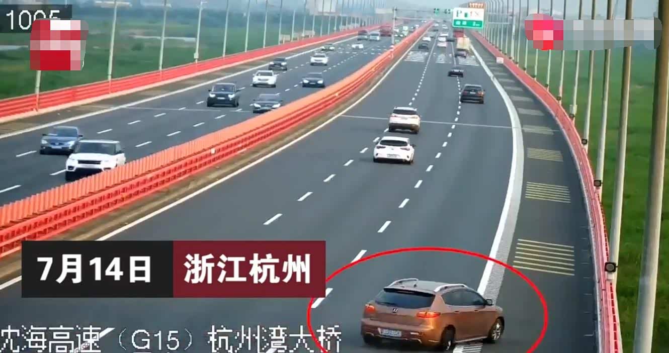 据了解,在7月14日杭州湾跨海大桥上一辆棕色轿车右后轮突然在第一车道爆胎,两分钟后小车终于开到了应急车道,打开危险报警闪光灯,5名司乘人员转移到护栏附近。