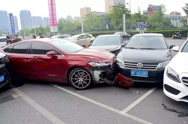 近日,在浙江海宁皮革城停车场发生了一起五车连撞的事故,交警到达时,现场一片狼藉,一辆黑色保时捷的引擎盖撞得掀起,左侧车门凹陷,安全气囊全部弹出,机油漏了一地。红色福特、黑色马自达、黑色大众、白色奔驰不同程度受损,五辆车撞成了一堆。