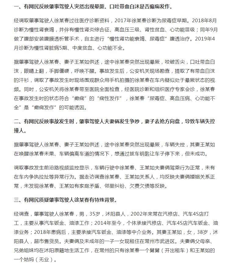 江苏常州奔驰车祸致3死10伤,面对7大疑问,警方7月20日一一回应。警方透露出许多关键信息,事发时驾驶员的状态符合癫痫发作,但无法证明其有癫痫病史,沿路监控未发现夫妻事发前有争吵打斗,徐某确实穿拖鞋驾驶。 司机癫痫发作时,其妻曾试图拔钥匙控制车辆。