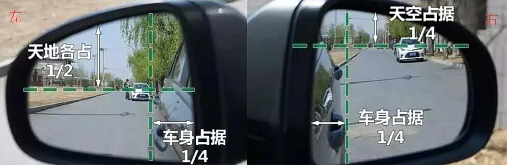以左后视镜为例,在镜面上车身占据到后视镜镜面四分之一,天地之间各占一半为最佳角度。而在后视镜上,天地之间留给天空部分四分之一就够,车身还是留下四分之一的镜面为最佳。