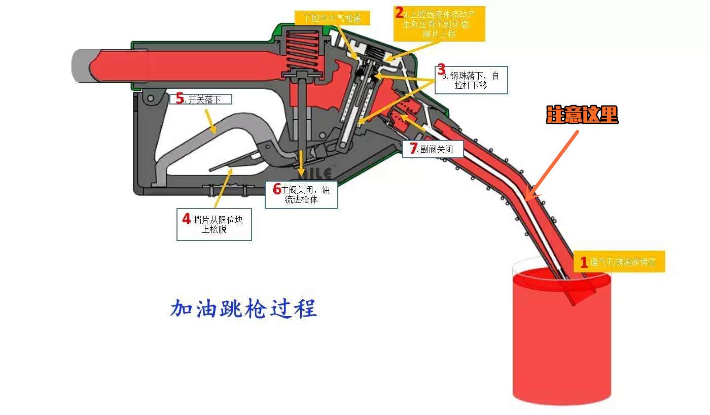 “跳枪”是加油过程中一种比较常见的现象。代表加油枪在加油过程中,自动关闭。而为什么加油枪会自动关闭呢?我们从上图可以看到,加油枪的加油管中间还有一个小细管。它是一个传感器。当这个小细管接触到返回的燃油后,就表示油箱已经加满,无需加油,所以自动切断了油枪的供油。这也是一种安全保护装置。