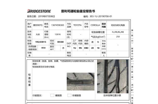 更让车主史先生难以接受的是,普利司通厂家仅仅是通过4S店向其提供的轮胎照片,就鉴定为正常老化,并出具了鉴定报告,并未亲自对轮胎进行检测。史先生对鉴定报告的可靠性存疑。