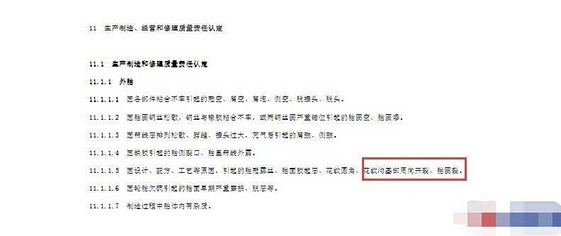 而《轮胎经销企业经营规范 理赔要求》也规定了,生产制造和修理质量责任认定中明确包括了“因设计、配方、工艺等原因,引起的胎冠露丝、胎面胶起层、花纹圆角、花纹沟基部周向开裂、胎圆裂。”