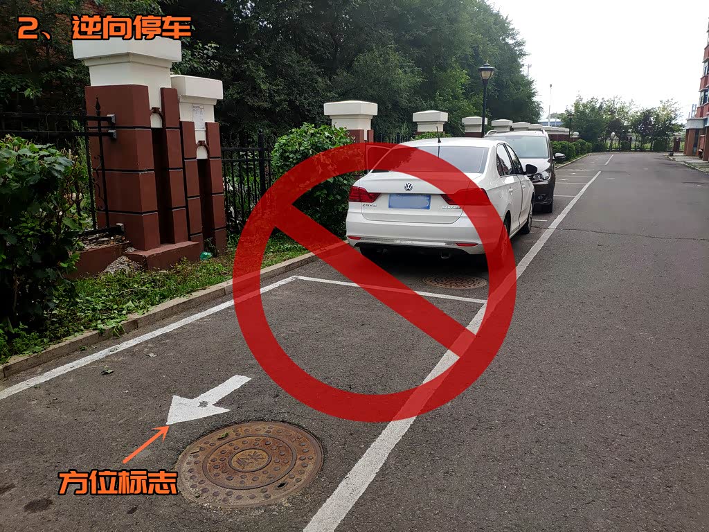 停车位有明确的方向箭头标示,而车辆停放位置与箭头方向相反。这也是一种错误的停车方式,尤其是在一些单行车道上。很可能会被认为车辆逆向行车。