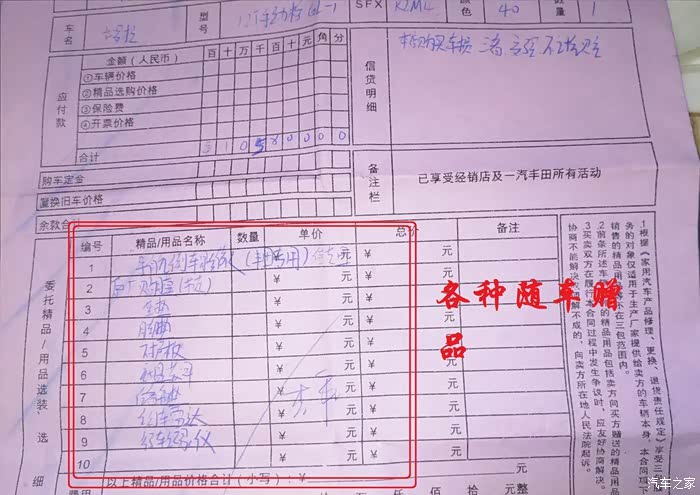 这里晒出一张我当时订车协议,划重点:将近十样随车赠品,包括导航大屏、倒车影像、原厂贴膜、坐垫、脚垫、下护板、底盘装甲、后备箱垫、倒车雷达、行车记录仪。是不是种类很多很全面,4S服务很贴心?没错,当时购车时我也是这么想……