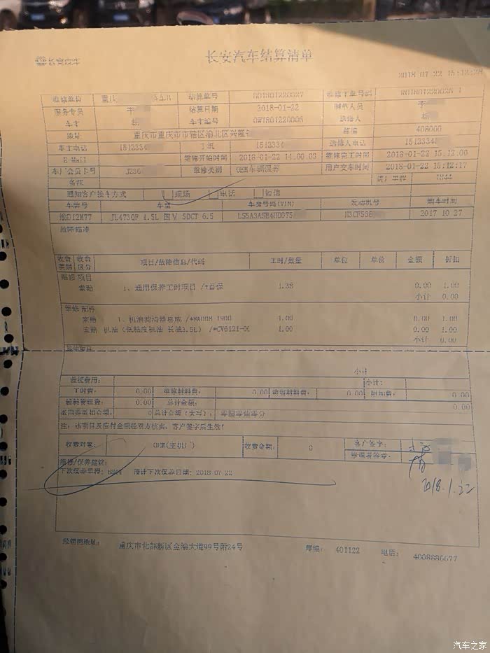 服务凭证:详细结算清单,就只有机油滤清,和长城机油,都是免费的。完成签字确认。