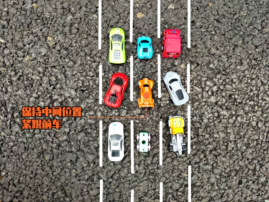 如果你是在中间车道的话,那就没必要向左或向右,始终保持在中间位置即可。此时你需要注意的就是保持车距和跟车前行。