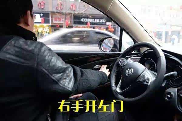 4、采用“荷式开门法”开启车门,用距车门较远的那只手开车门,即坐在车辆左边的时候用右手开车门,坐在右边的时候用左手开门。