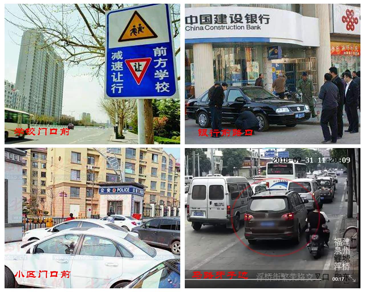 学校门口前、银行前路口、小区入口前、马路牙子边