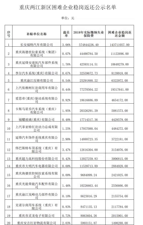 近日,重庆举行困难企业稳岗返还发放仪式,现场对符合条件的39户企业返还资金2.9亿元。有眼尖的网友发现,这39家企业全部是汽车级或部件企业。