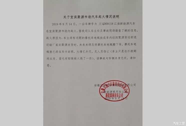 8月14日,江淮纯电动SUV自燃起火事件的监控视频在社交媒体上曝光,今天江淮官方火速针对该起事件进行了回应,表示本次事故未造成人员伤亡,具体事故原因为车内运载的有问题的摩托车电瓶发生自燃,从而导致车内起火,与车辆本身无关。