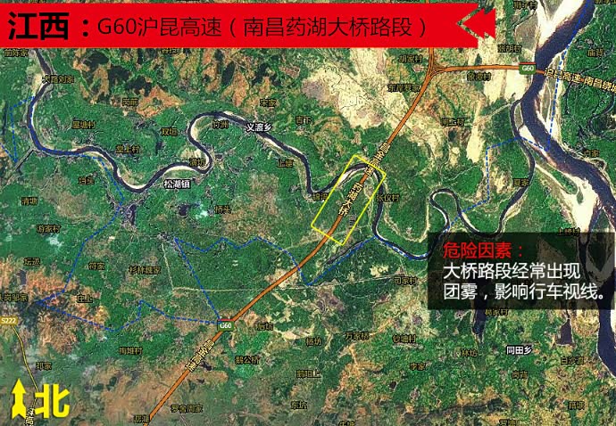 该路段已经发生过多起群死群伤的重大交通事故。其主要原因就是在该路段的桥下有一个面积很大的湖泊。由于空气湿度大,经常会在周围产生大面积的团雾自然现象。由于仅仅是团雾,所以途径此处的驾驶员并不能快速适应这种驾驶环境,出现交通事故也就不足为奇了!