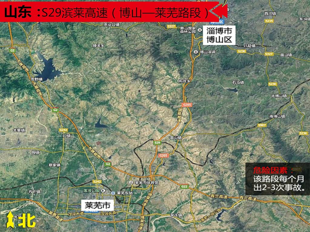 该路段是山东省的一条山区高速路段。由于地势复杂,导致路面有高低起伏的变化。以至于在此行驶的车辆经常出现交通事故,据说每月都会发生2-3起较严重的交通事故,牵连车辆至少10几辆。