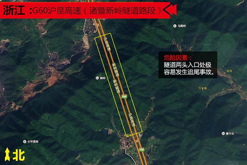 该路段是一个隧道高速路段。由于隧道距离不长,途径此处的车辆时速都较高。而在隧道的出入口处,由于光线的变化过于强烈,很容易造成驾驶员的视线短暂受阻,所以在此隧道出入口经常发生车辆追尾事故,该路段也被当地人称之为“伤心的隧道”,据说平均半小时就会发生一起交通事故。