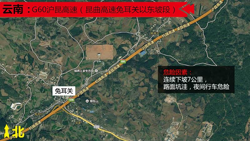 危险原因:山区高速,路况复杂,高低起伏不断,陡峭弯路也十分常见。