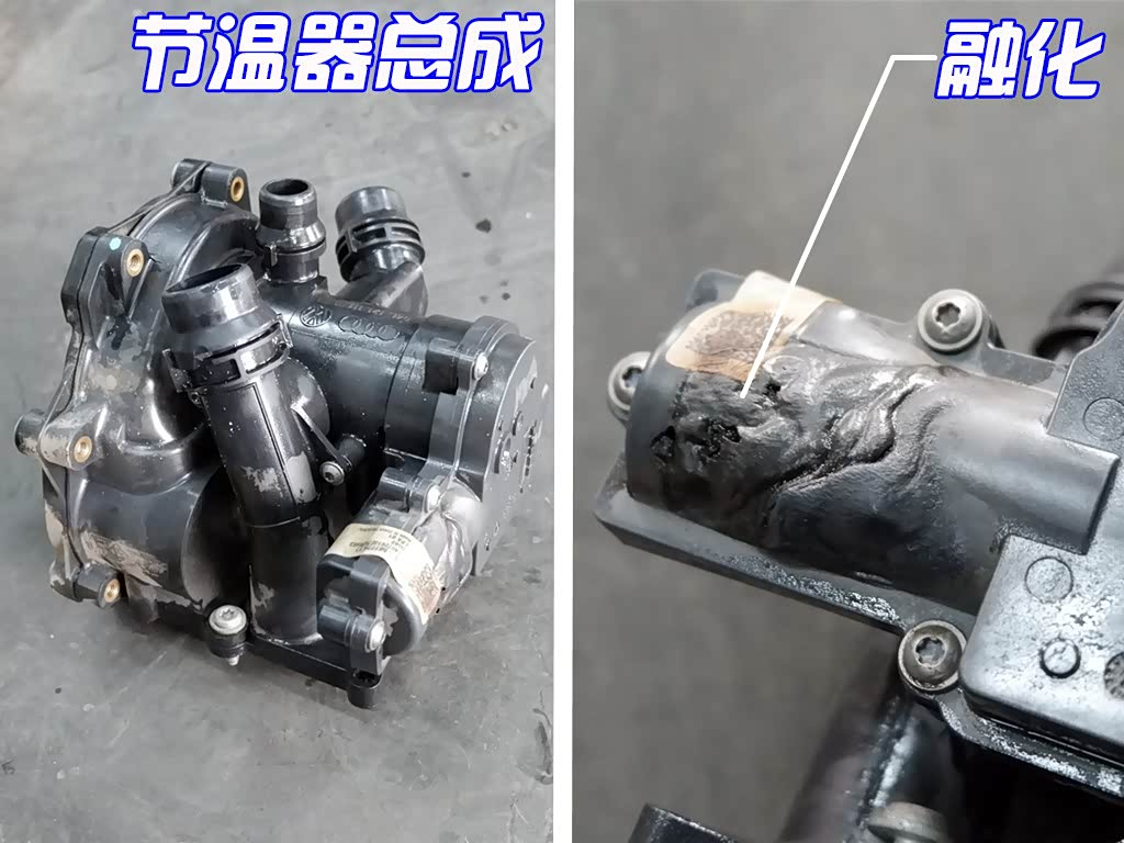 千万不要小看这个锈迹,更不要小看仅存的一点点水渍。这是奥迪的节温器总成,看到左边已经被烧融的外壳了么,还敢说泡水没事!