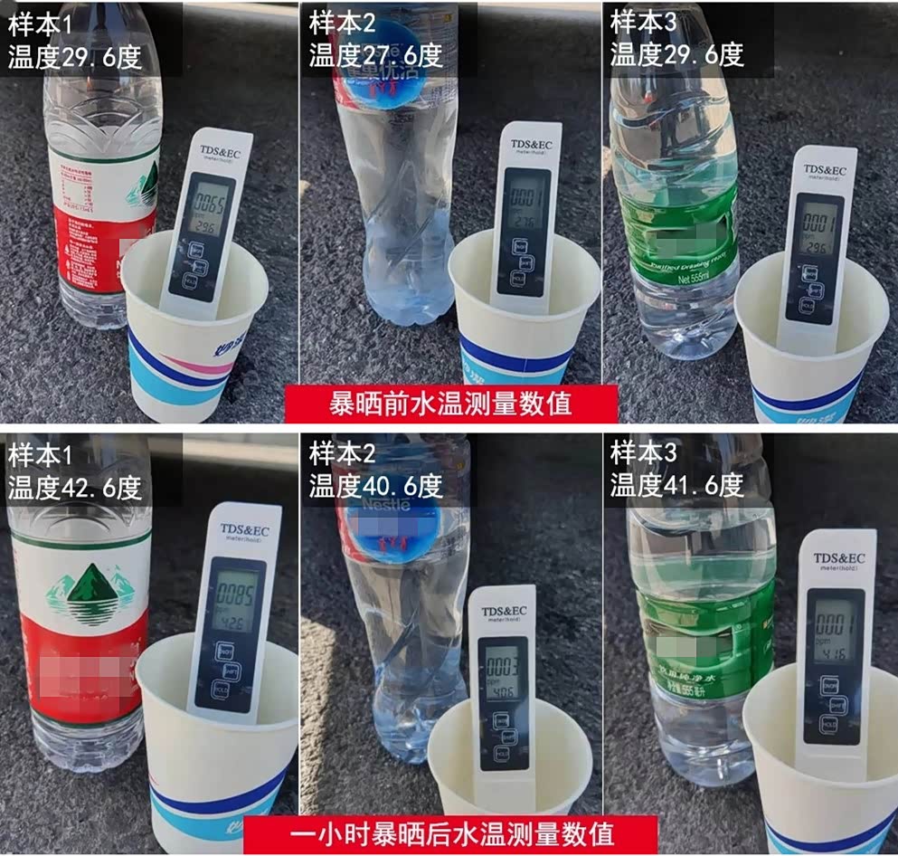 从测试的结果来看,虽然车内温度高达70°,但它只是空气温度。这个温度并不会将水也烘烤到这个温度,所以就算你的瓶装水放在太阳下暴晒,也基本控制在50°以内,很难再高了。而距离测试的70°高温,还有20°的差距。可向而知会有什么有毒物质挥发呢?所以从食品的安全性上来说,瓶装水暴晒后是不会有有害物质产生的。只不过会严重影响口感,对于一些引用过的瓶装水,高温后也容易让细菌快速滋生而已。
