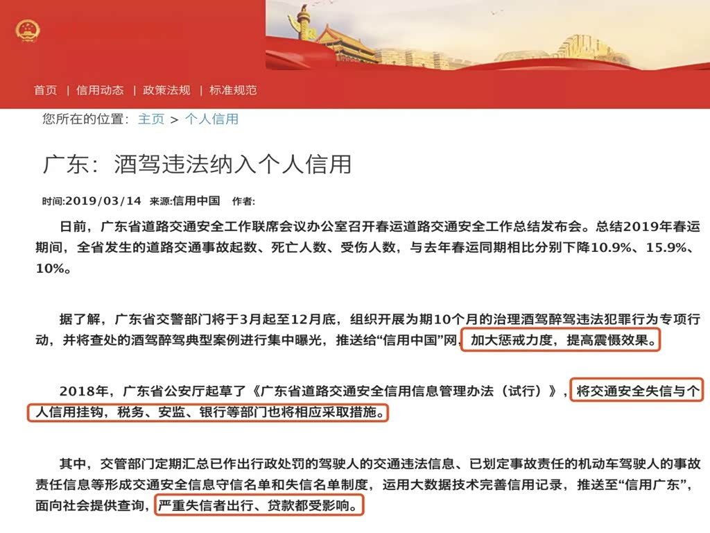 这并不是危言耸听。就在今年的3月,广东省已经开展将酒驾违法行为纳入失信名单的专项活动。从3月-12月,为其10个月的专项整治,一旦被抓到的酒驾司机,不仅面临罚款+吊销驾照的处罚,还要将其推送到“信用中国网”失信人名单中。