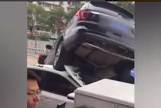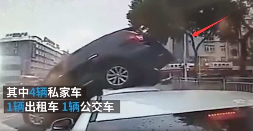 根据一辆事故车辆的行车记录仪视频显示,车辆行驶中追尾前方车辆,前方车辆在撞上前方车辆,一辆接一辆,而一辆黑色越野车被前后两车夹击,直接被顶到了空中。目前现场只有2人轻微受伤,具体事故原因相关部门还在调查当中。