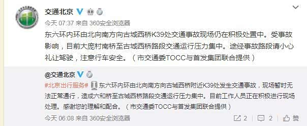 目前,东六环北向南方向队尾排到通营桥;南向北方向队尾接近施园桥,拥堵长达6公里,工作人员也在积极进行现场处理。