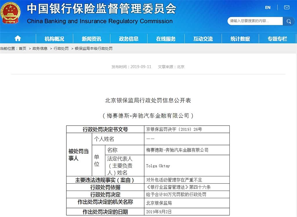 近日中国银保监会发布了一份处罚信息表,显示梅赛德斯-奔驰汽车金融有限公司因“对外包活动管理存在严重不足”问题,依法对其行政处罚80万元的罚款在4月初西安奔驰女车主提车发现发动机漏油。除车辆质量问题外,女车主还揭发西安利之星违规收取15200元“金融服务费”,随即引起税务局、银保监局的高度重视。
