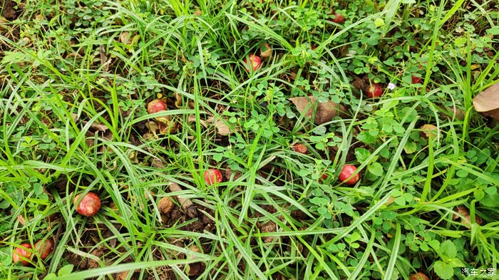 树上的果子成熟后洒落在地面上。