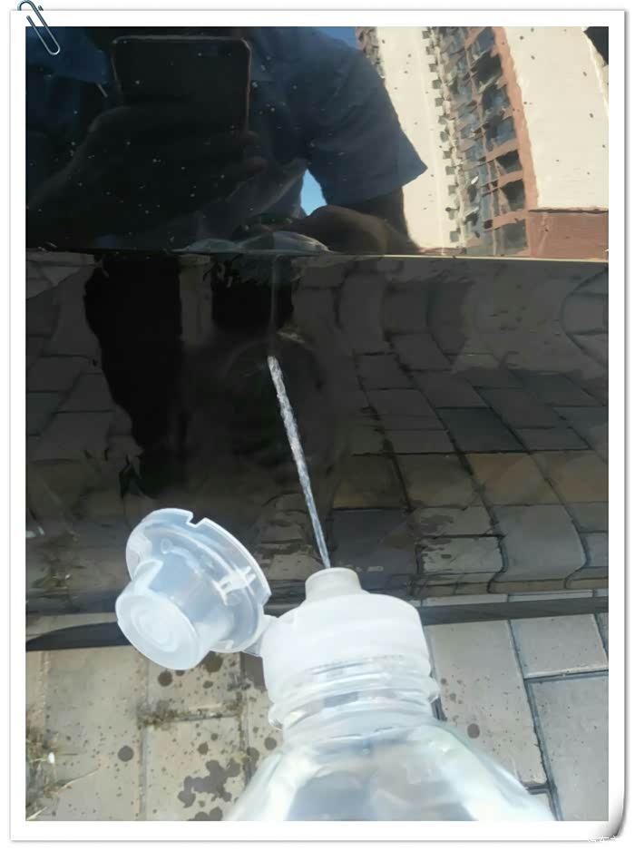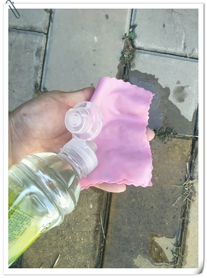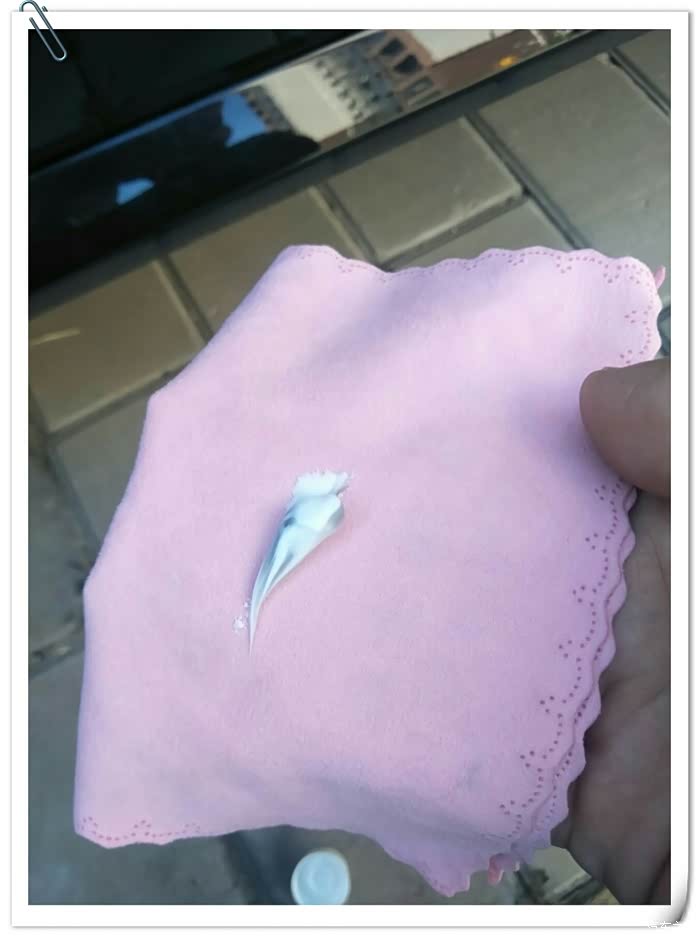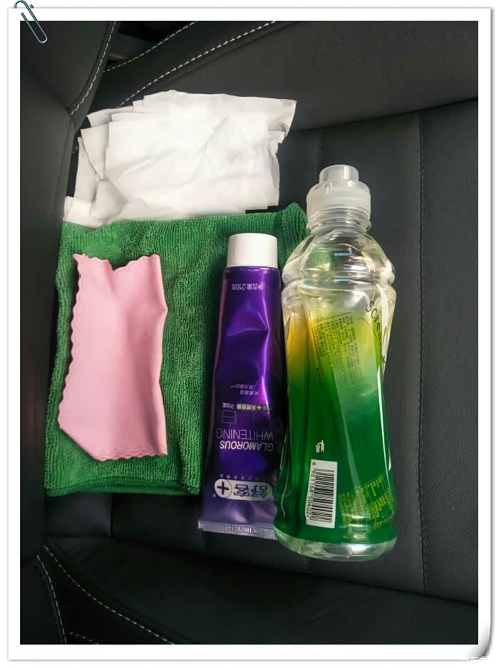 首先准备了些要用到的物品,非常简单,一支牙膏(这是最主要的,也很方便找到,生活必备品嘛), 一瓶水(喝完的空饮料瓶装上自来水),一块柔软的布(我拿的擦拭眼镜用的布,柔软又不伤车漆),一块擦车巾(备用),抽纸若干张。