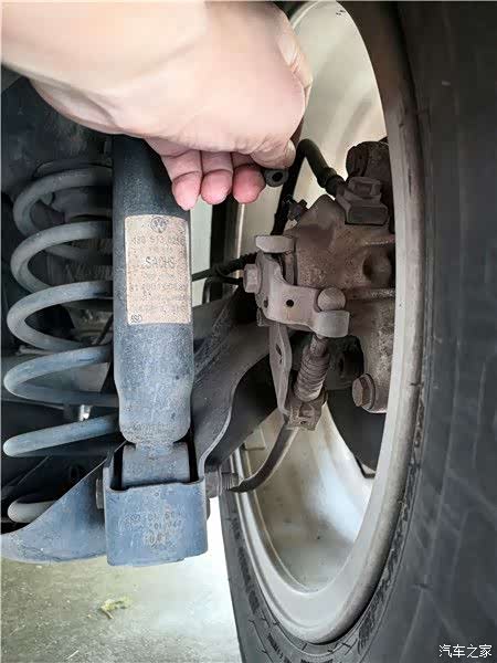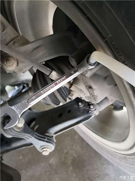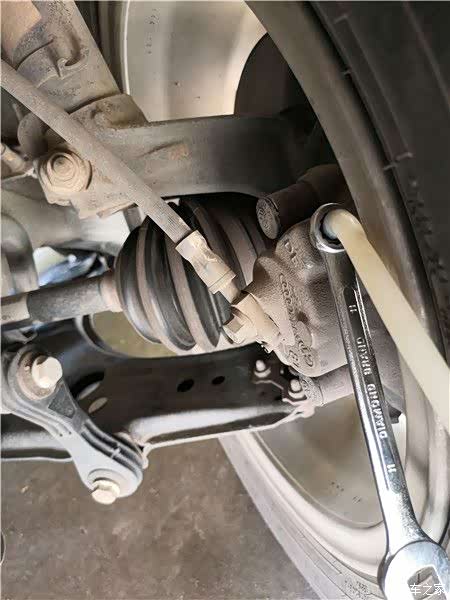 车子停着,方向向左打死,就可以把手伸进去,操作左前轮的刹车分泵防油口,进行左前轮刹车油的更换。