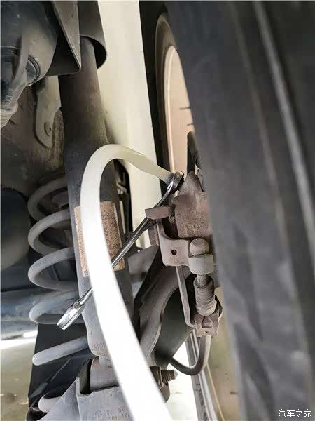 左后轮分泵,其实操作都是一样的,找准防油口,套上硅胶管,松开防油口,就可以开抽。