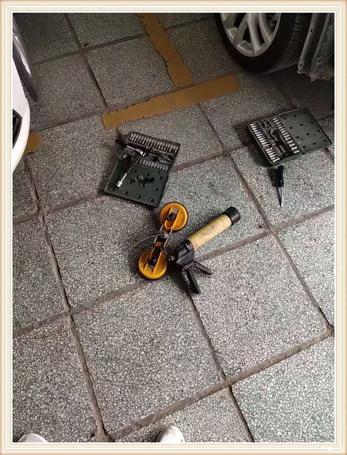 接着小师傅取来了拆卸风挡玻璃的工具,有一根细的钢丝绳,密封胶枪,还有带有两个吸盘的工具,这个叫绞盘,拆卸玻璃就靠它了。