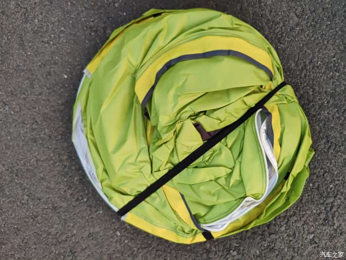 打开收纳袋,发现帐篷是用一个松紧带简单固定的
