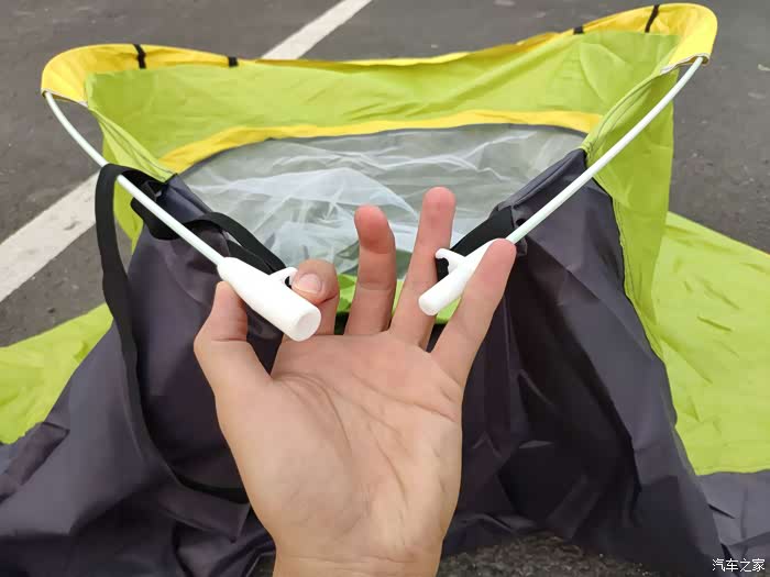 整个帐篷只有两根玻璃纤维杆,柔韧性非常好,不怕折断,关键是重量轻。