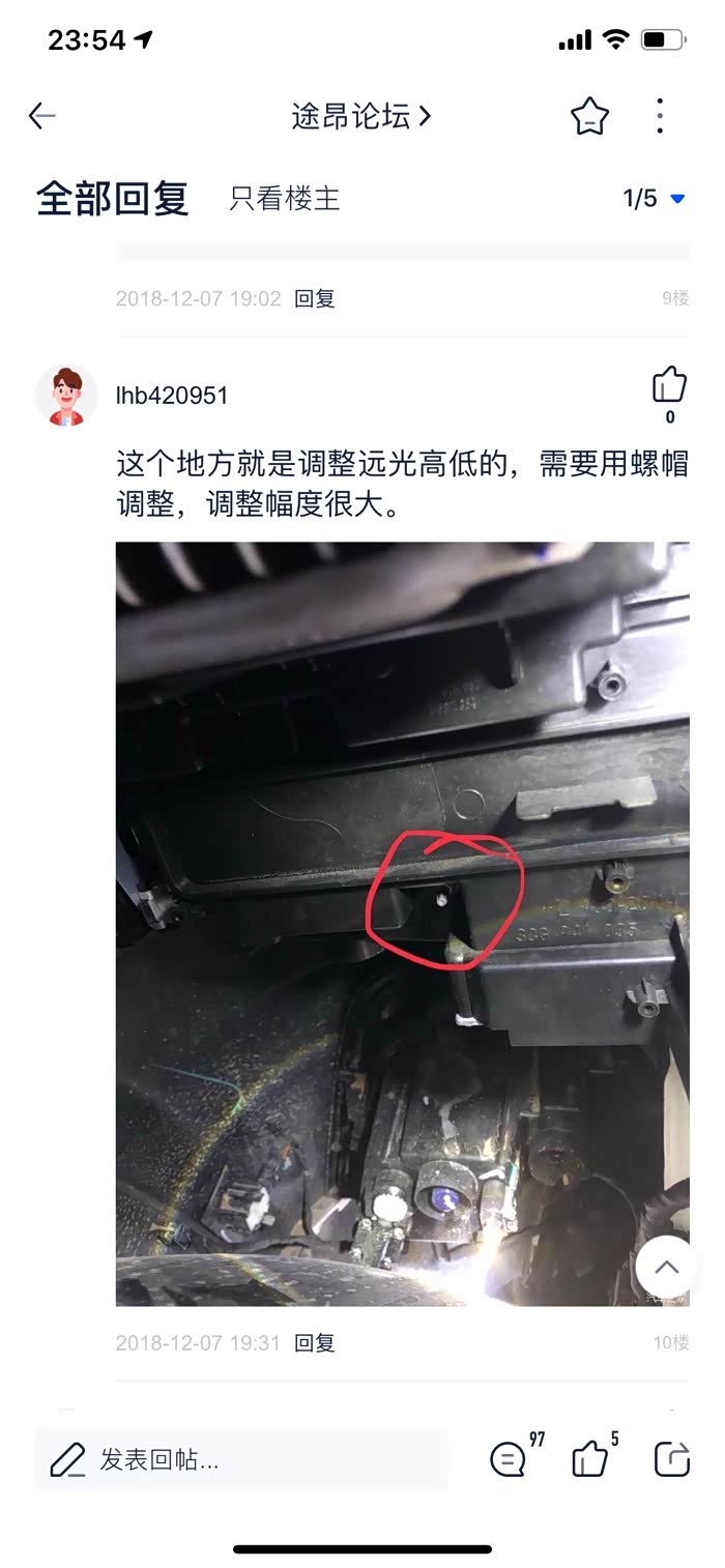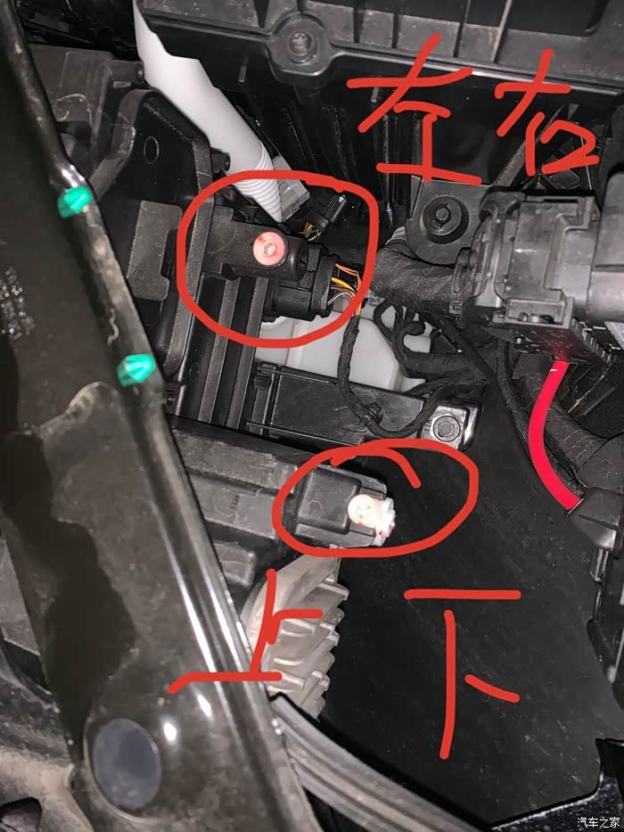 只要是汽车都能调节大灯高低,说途昂不能调大灯高低的麻烦先抽自己几个巴掌再看此贴!大灯调节基本都是打开引擎盖,然后灯的后面找塑料连接齿轮的螺丝孔,没错,这就是途昂的大灯调节扭!外侧的是调节灯光高低,内侧是调节灯光左右平移,注意了,这两个都是远近灯光同时调节!注意是同步调节!