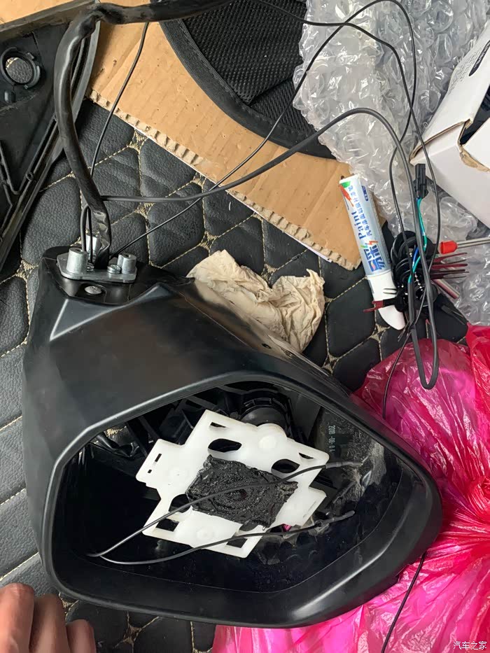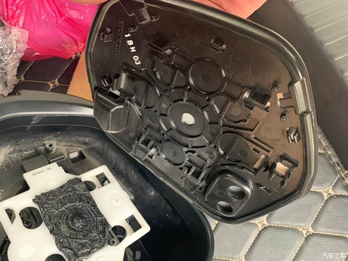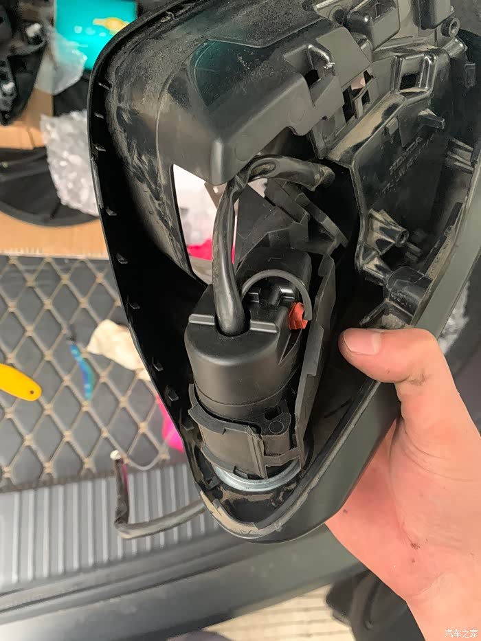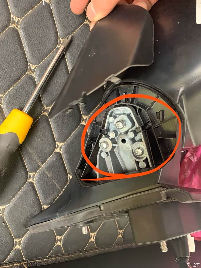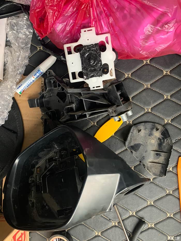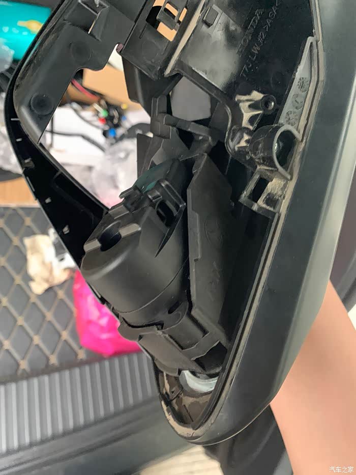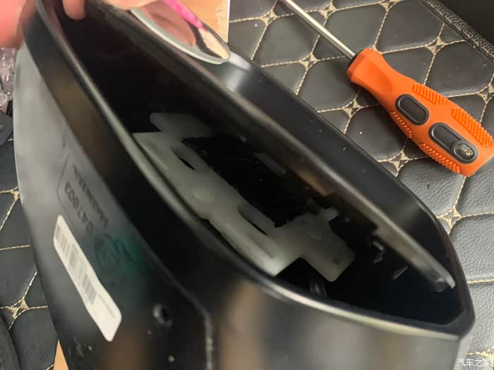 最难的是这个需要掰到一定程度用长的螺丝刀一投就开了。这一步为止后视镜的外壳就算是分开了。