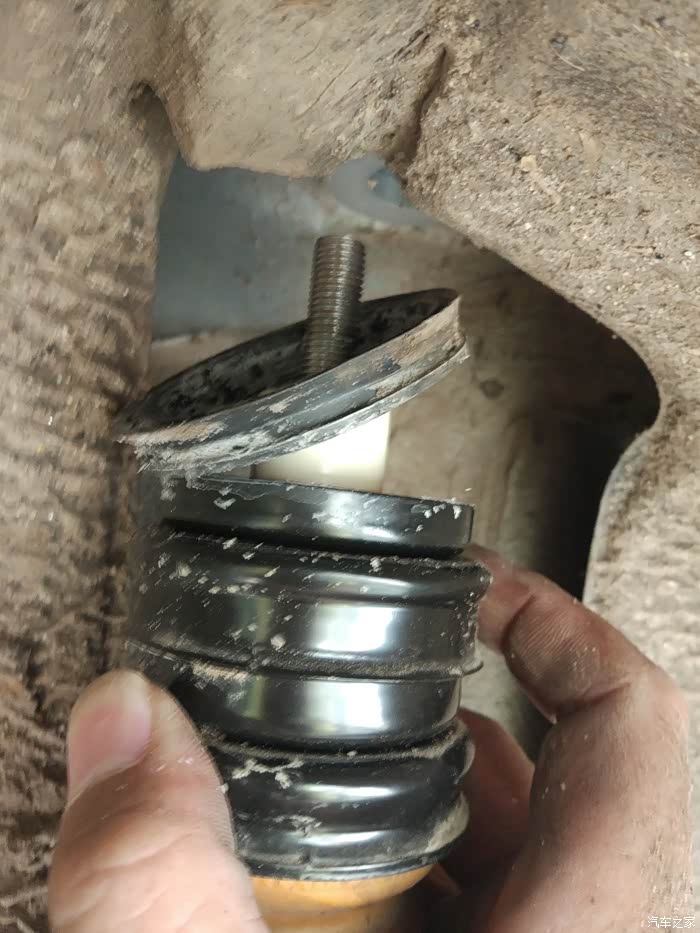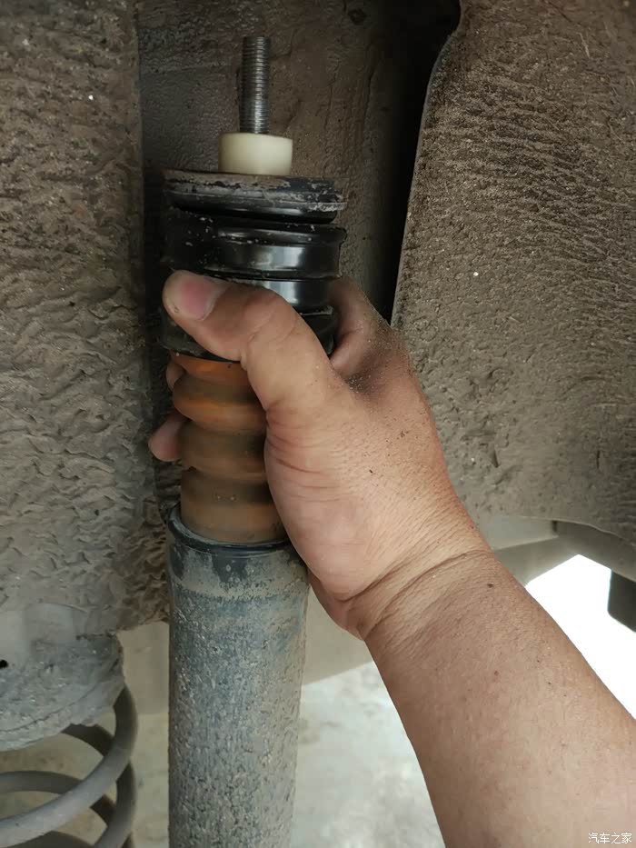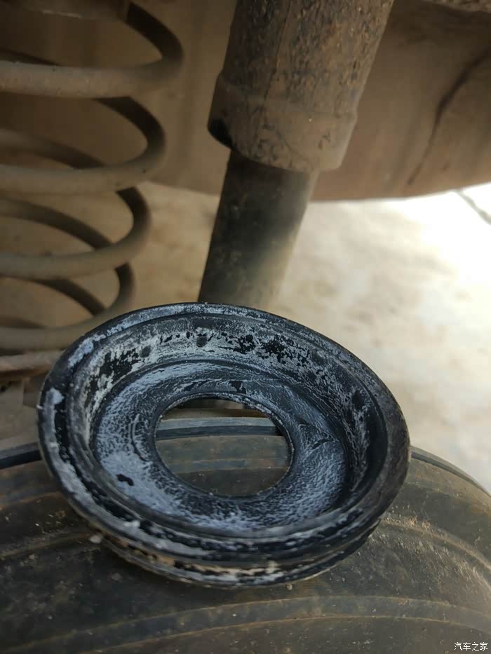 没有防尘套保护,缓冲胶露了出来。车轮夹带着灰尘雨水小石头的撞击,缓冲胶也会很快老化