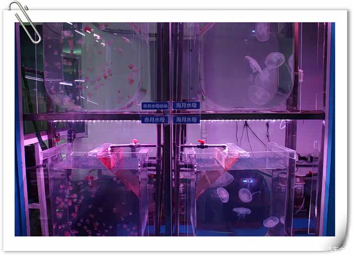 造型各异的缸体展示,通过背景音乐、五彩光源展示出各种水母的神秘。几百种水母宛如一位轻盈的舞者,如水下穿梭的幽灵,带来别样体验。