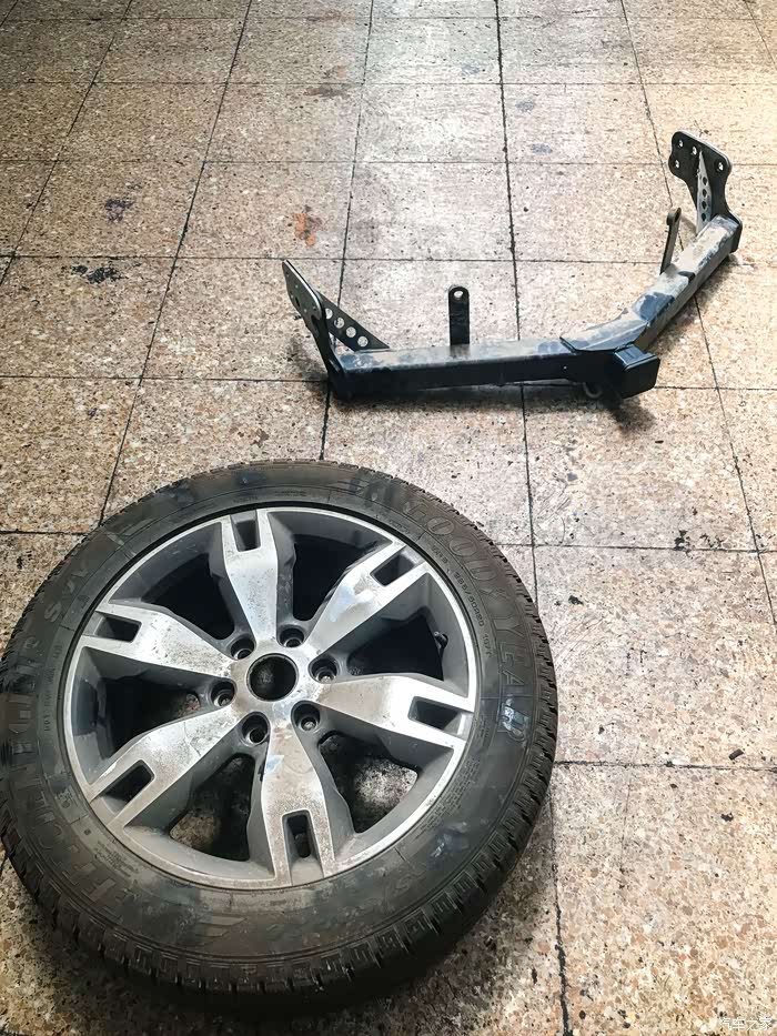 拆下来的后杠和准备要换回来的轮胎