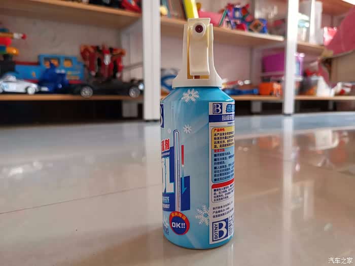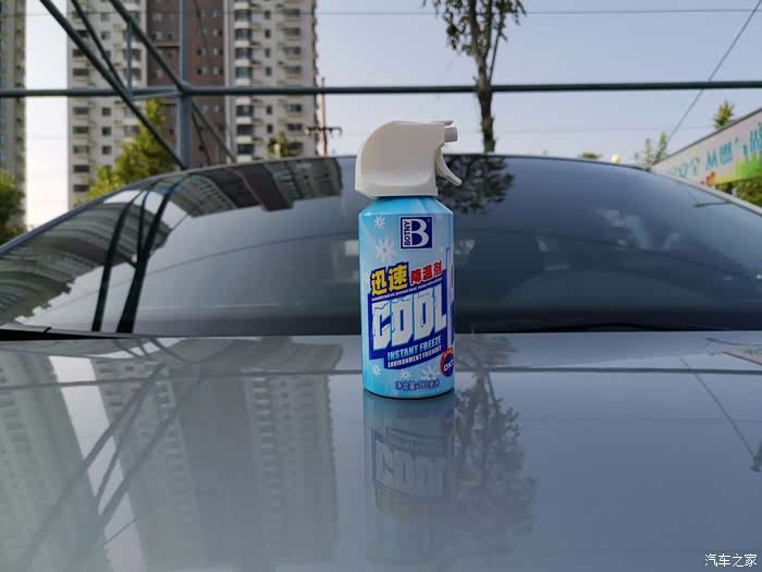 来到室外,先把保赐利迅速降温剂放在机盖上拍一张。