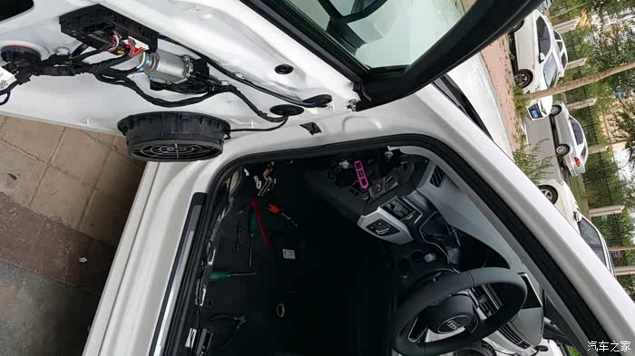 首先是布线。门板全部拆掉,加装无钥匙进入模块,并且布线,还有加装门灯,拉手灯,脚窝灯等等的线路。这部分时间最长,基本上耗了一天的时间。天黑了才结束。