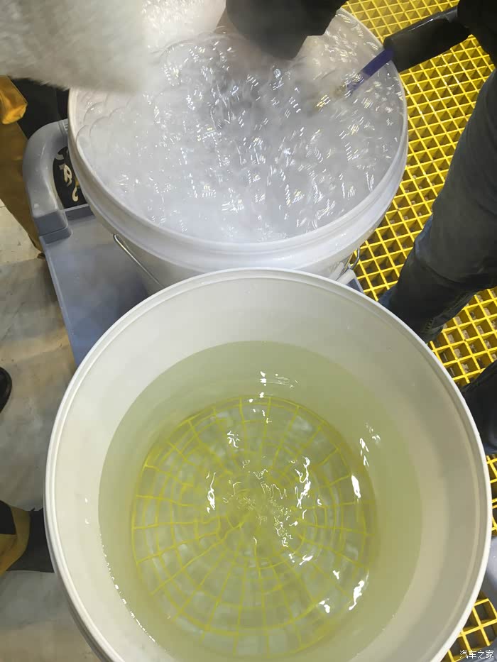 另一桶水开始加洗车液,旁边的一桶则是清水。水桶下面的滤网用来过滤车上下来的尘土。 洗车真够费劲的
