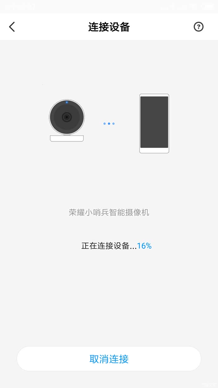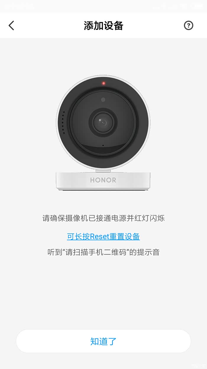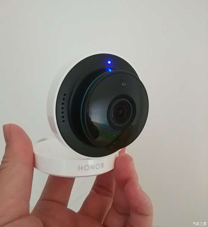 这款小哨兵摄相机,是智能的,连接也很方便,首先使用电源适配器,给小哨兵通上电,然后会看到红灯慢闪,这是等待联接的提示。然后此款报相机并有语音提示欢迎声,并且让扫描手机二维码,这个我挺意外的。同时要给手机下载荣耀智能摄像机APP。下载完后直接添加摄相机,这个时候可以看到提示灯蓝色快闪中。然后输入自己的网络WIFI密码,点击下一步,就生成了一个二维码在手机屏幕上,然后直接对准摄相机。会有语音提示,扫描成功,请稍后正在连接,已上线等语音播报。在连接的过程中小灯由红色变成蓝色慢闪,表示摄像机连接WIFI过程中。连接成功后这个小灯会变成蓝色长亮。