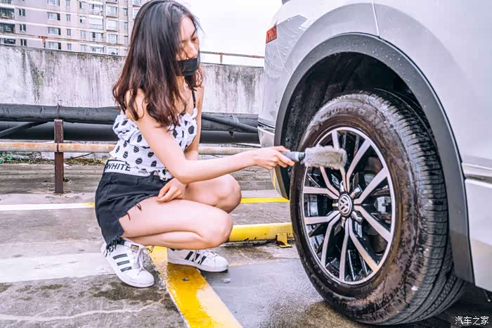 轮毂是平时最容易堆积灰层地方,水蜡要多喷一点,喷完以后用这个特质刷子刷钢圈,一般洗车店直接用钢丝球刷钢圈,头实在太铁,我看着都心疼。