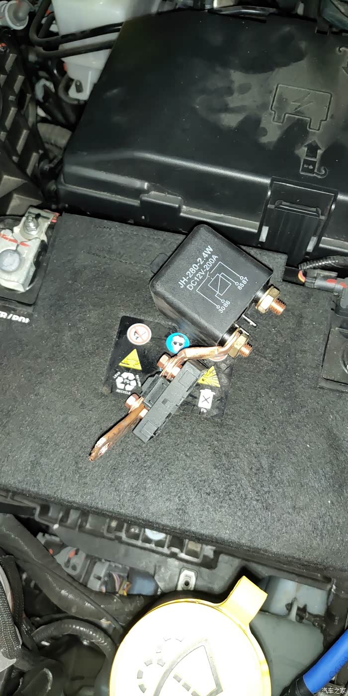 自己改装了2个连接件。(用的空调铜管加25平米电线的线芯,再敲扁,打孔)。左边是连接电瓶的中间是个保险暂放的100A的(如果准备用电1500W需125A),右边是一个200A的继电器。