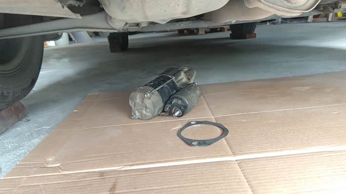 马达总成从车底拿下来,这次垫片也一起下来了。另还有两个定位的插销,眼睛看不到,我用手摸了一下,在发动机上很牢固,不用管它