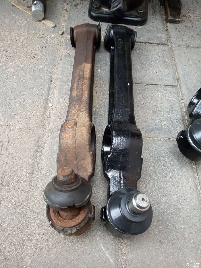 把稳定杆和托架拆掉,即可取出下支臂了,这是新旧两个对比,旧的已经完全干涸了。新的球头黄油上的也不好,幸好我打开胶套查看了一下,否则又要被奸商坑了。