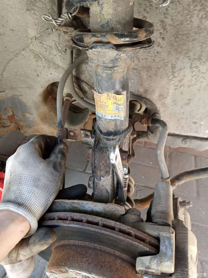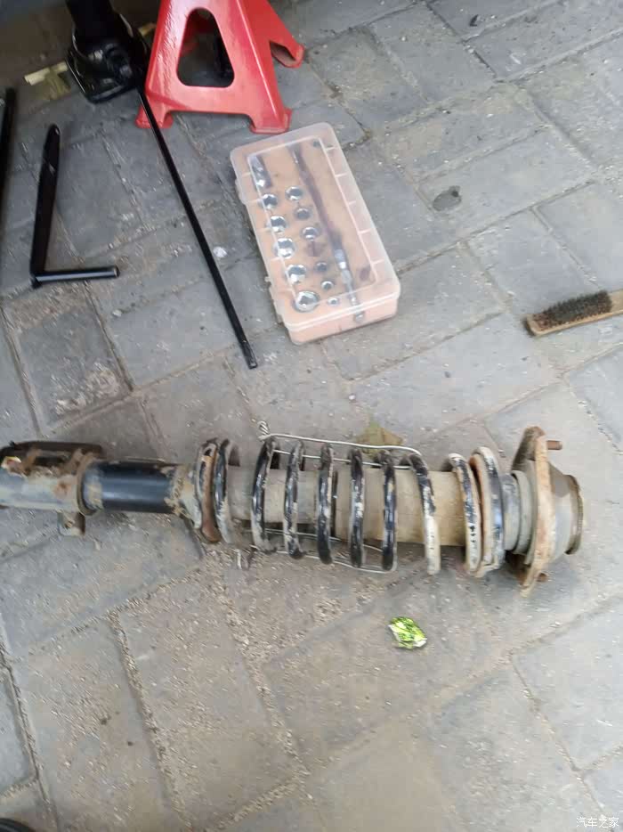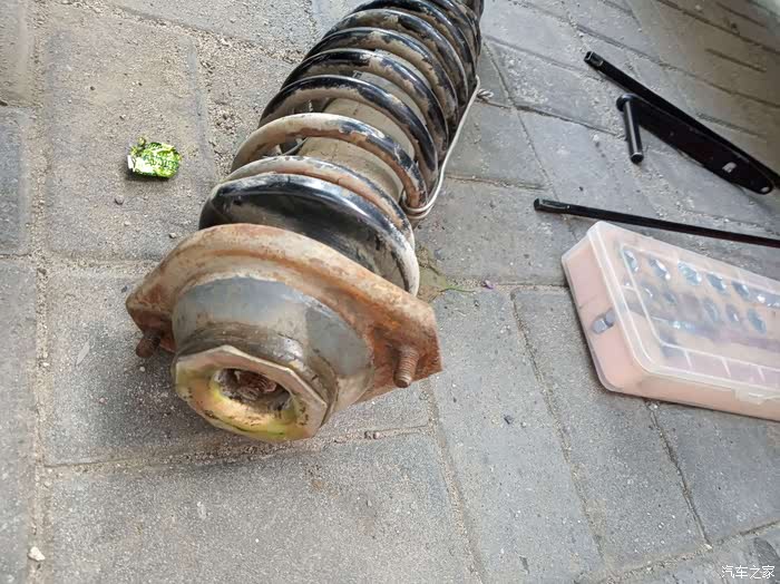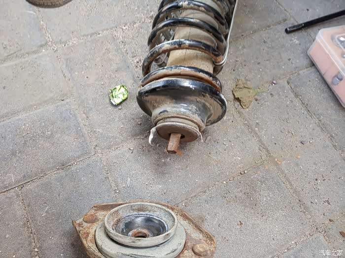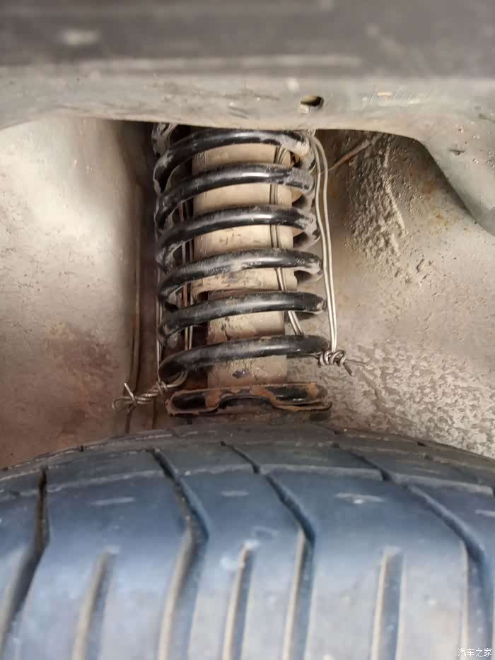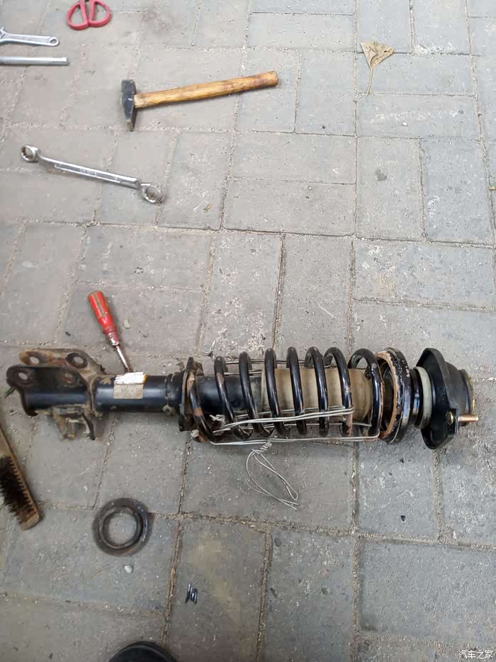由于弹簧有两道没有压缩,还需要用铁丝压缩一下才能安上。我是用铁丝绑上用铁管拧的。把新的顶胶装上后,大螺母紧上,就可以把铁丝松开,弹簧都归位妥当就可以安车了。