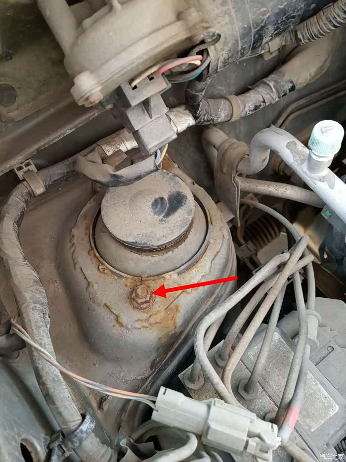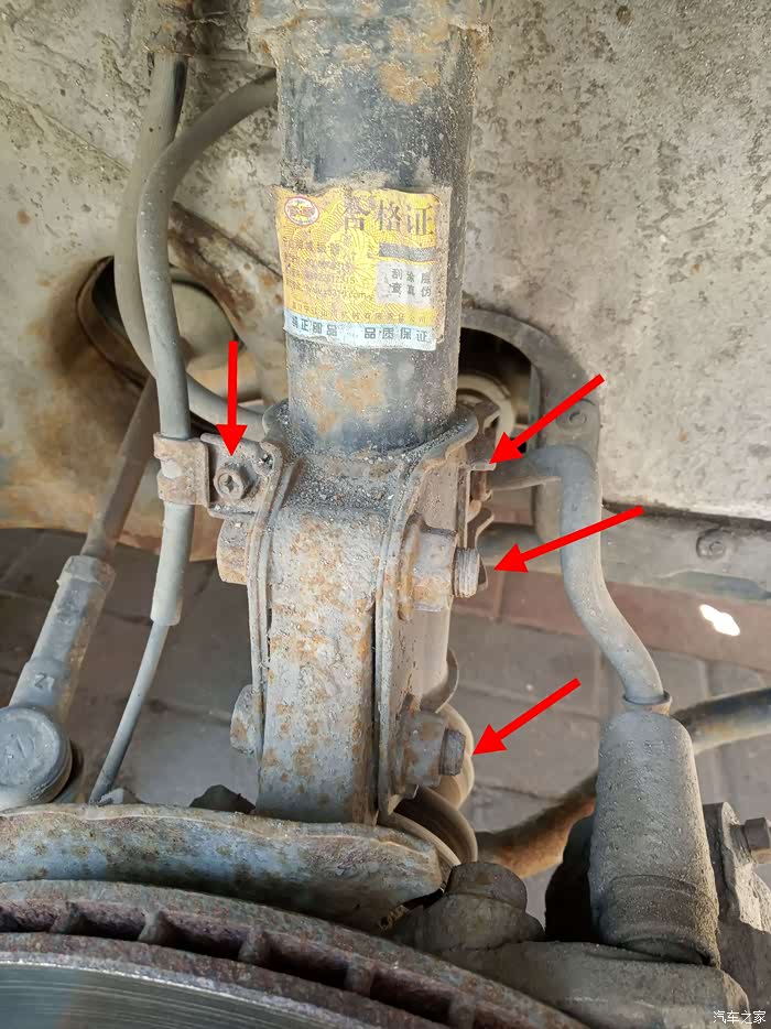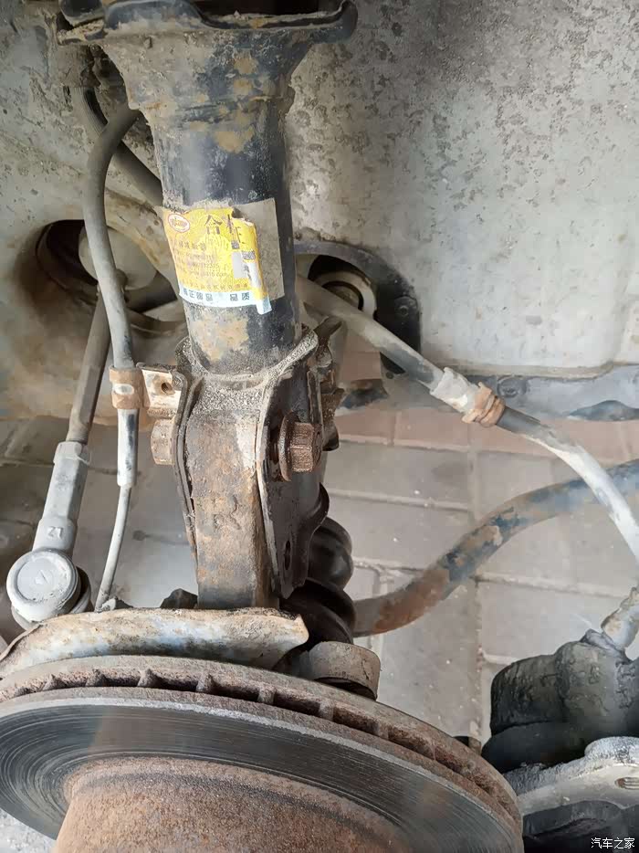下面就要拆减震下面两个大的固定螺丝,由于从来没有保养过,相当紧,全是18mm口径,加长臂大力搞下来。左边是ABS感受器,右边的粗管是卡钳刹车油管。全拆下来。