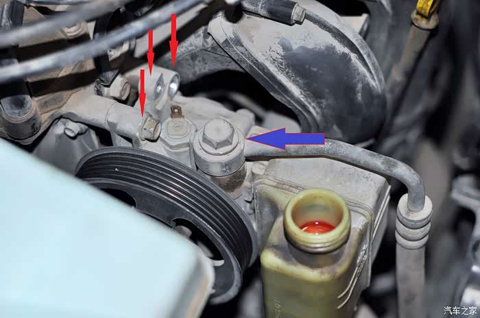 助力泵是通过发动机传动皮带带动工作的,皮带拆下后,下一步是拆三个固定螺丝(如图红色箭头),然后再拆助力油回油口螺栓(如图中蓝色箭头),最后将助力泵下端的油管拔下即可。