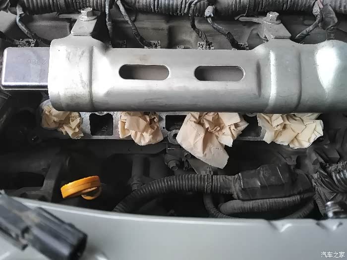 把洗料倒进进气歧管,流出来变成黄色的了,证明里面很脏,对进气是有影响的。进气口,防止脏东西进去,用纸堵住。