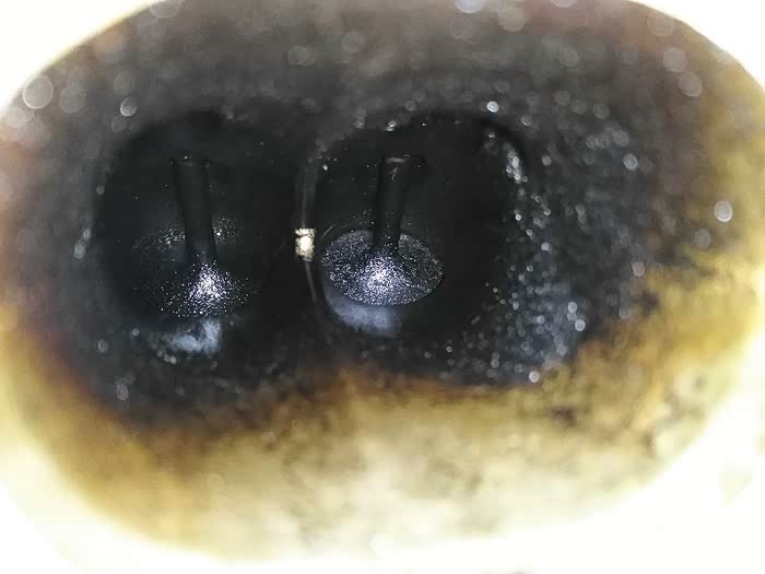 大概泡了半小时,倒出草酸,已经变成绿色,有一些杂质,后证实是积碳。阳光的三元分两段,氧传感器前面的孔洞比较细,后面的就粗一些,这是清洗前的前端三元。